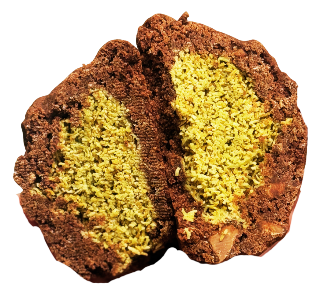 rich chocolate dough with milk chocolate, stuffed with the one and only viral pistachio kataifi filling